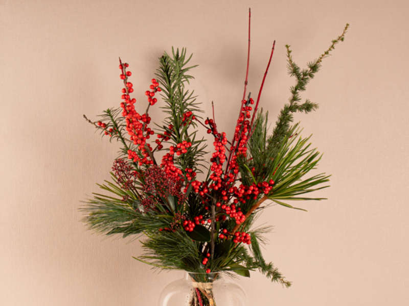 Sfeervol winterboeket met rode bessen en verschillende soorten dennentakken.